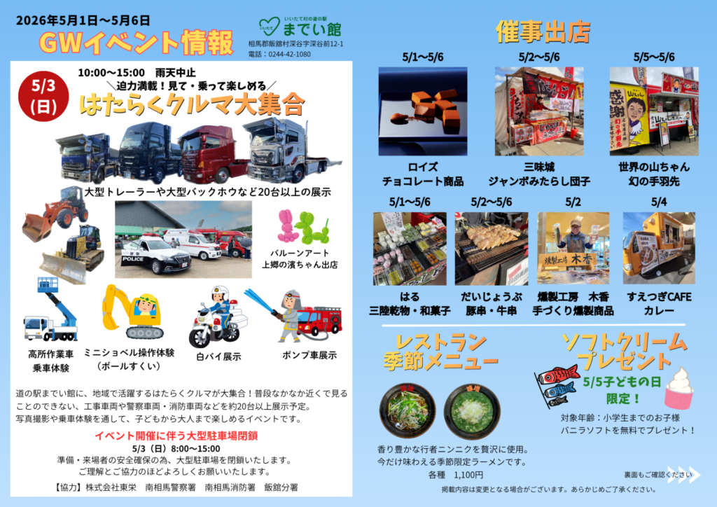 2026年5月1日から6日までのゴールデンウィーク期間中、様々イベント等を開催します。