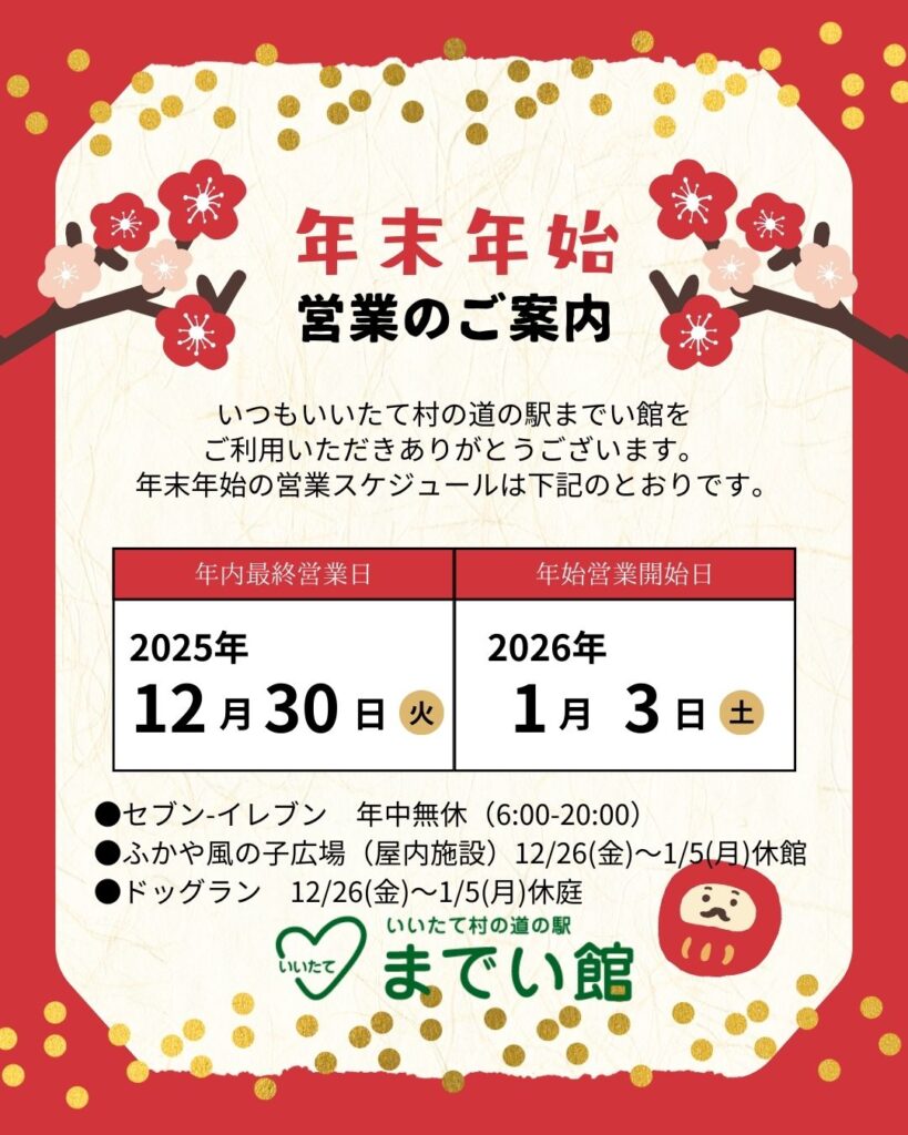 いつも、いいたて村の道の駅までい館をご愛顧いただきまして誠にありがとうございます。下記の通り、2022年1月からご変更させていただきます。お客様には、大変ご迷惑をおかけいたしますが、何卒ご理解のほどお願い申し上げます。