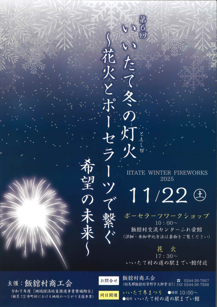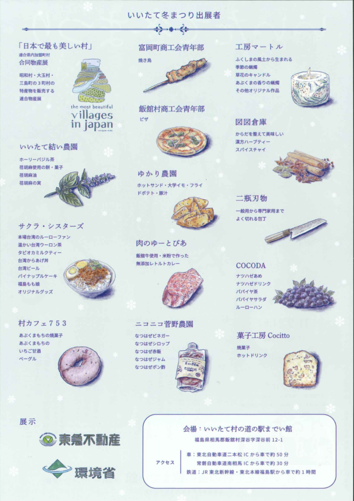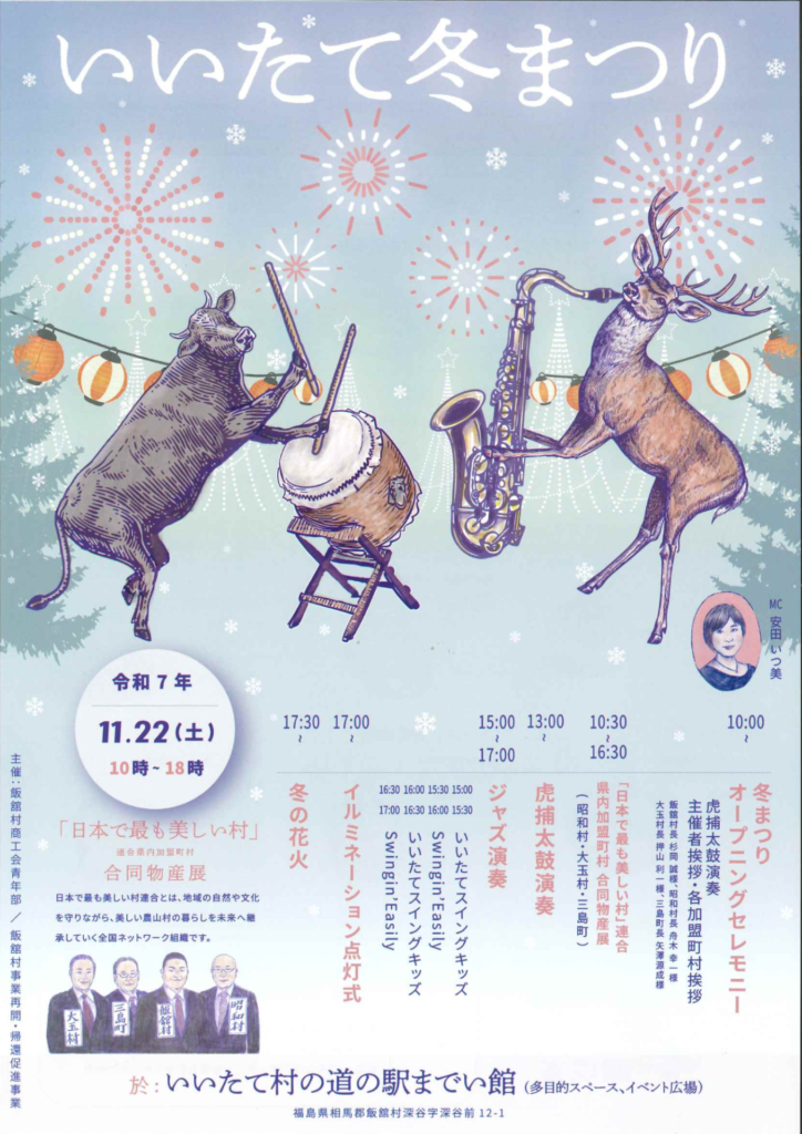 幻想的なイルミネーション、心あたたまる音楽ステージ、冬の花火など、1日を通して楽しめるイベントです。「日本で最も美しい村」連合による特産品販売や、飯舘村のグルメなども勢揃いします。